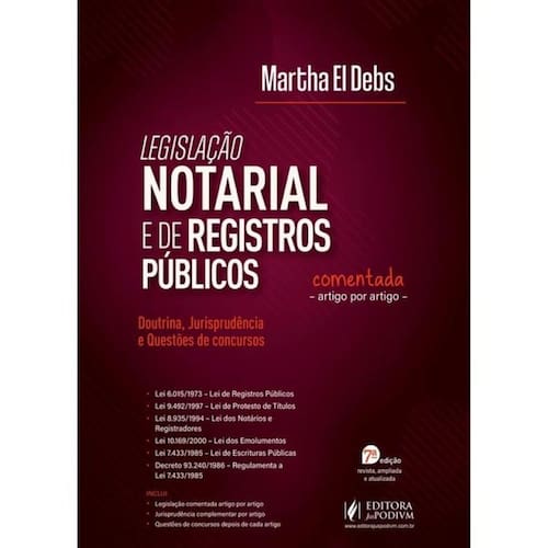 CONTÉM: • Legislação comentada artigo por artigo • Jurisprudência complementar por artigo • Questões de concursos depois de cada artigo LEIS COMENTADAS: • Lei 6.015/1973 – Lei de Registros Públicos • Lei 9.492/1997 – Lei de Protesto de Títulos • Lei 8.935/1994 – Lei dos Notários e Registradores • Lei 10.169/2000 – Lei dos Emolumentos • Lei 7.433/1985 – Lei de Escrituras Públicas • Decreto 93.240/1986 – Regulamenta a Lei 7.433/1985 POR QUE ESCOLHER O LIVRO “LEGISLAÇÃO NOTARIAL E DE REGISTROS PÚBLICOS COMENTADA ARTIGO POR ARTIGO”? A presente obra destina-se a difundir temas do Direito Notarial e Registral a todos os operadores do direito que atuam na área – tabeliães, notários, registradores, escreventes, advogados, promotores de justiça, magistrados, despachantes, corretores e qualquer cidadão que se depare com a temática e tenha interesse por ela. A Lei 6.015, de 1973, possui mais de quatro décadas de vigência e ainda apresenta grandes desafios à atividade notarial e de registros. A doutrina e a jurisprudência continuam sedimentando interpretações sobre esta vetusta lei, também em razão do advento de diversos diplomas, incluindo a Constituição Federal de 1988, o Código Civil e os inúmeros atos normativos da Corregedoria Nacional de Justiça (CNJ), além dos Provimentos da Corregedoria-Geral da Justiça. Não é demais ressaltar que a legislação apresentada nesta obra dialoga com importantes temas do direito público e privado, especialmente com o direito civil, com o qual mantém uma relação intrínseca. Assim, era necessária a elaboração de um trabalho que entrelaçasse a legislação registral e notarial com os diversos ramos do direito, com o intuito de estabelecer um estudo globalizado, holístico, proveitoso e eficaz. Destarte, realiza-se um diálogo de fontes que não se limita apenas ao diploma civil. O livro apresenta um enfoque interdisciplinar e multicultural, interagindo com outros ramos jurídicos, como o Direito Constitucional, Administrativo, Tributário, Processual Civil, Penal e Ambiental, além de uma ampla legislação esparsa, como, por exemplo, as Leis 4.591/1964 (Incorporação Imobiliária), 5.709/1971 (Aquisição de Imóvel Rural por Estrangeiro), 6.766/1979 (Parcelamento do Solo Urbano), 8.069/1990 (Estatuto da Criança e do Adolescente), 9.514/1997 (Alienação Fiduciária), 12.651/2012 (Código Florestal), 13.465/2017 (Regularização Fundiária, Condomínio de Lotes, Direito Real de Laje), 13.775/2018 (Duplicatas Virtuais), 13.777/2018 (Multipropriedade), 13.709/2018 (Proteção de Dados), 13.784/2019 (Liberdade Econômica), 13.986/2020 (Patrimônio Rural em Afetação), entre outros. Adicionalmente, são considerados Provimentos, Resoluções, Recomendações e Orientações da Corregedoria Nacional de Justiça (CNJ), legislação sobre cédulas de crédito, letras e notas, além de inúmeros atos normativos que têm notável impacto na atividade notarial, registral e extrajudicial. A crítica e a avaliação dos leitores serão sempre bem-vindas e vão colaborar para o aperfeiçoamento da obra. Martha El Debs