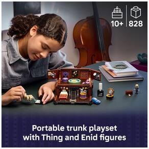 Composto por 828 peças, o kit apresenta um baú de dois andares que se abre para revelar o interior do apartamento do Thing. O espaço inclui uma cama, cadeira, chapéu, relógio e compartimentos para armazenar itens como adesivos, creme e outros acessórios pessoais do Thing. Além disso, o set acompanha uma figura posável do Thing e uma minifigura da Enid Sinclair, colega de quarto de Wednesday, permitindo recriar cenas icônicas da série.