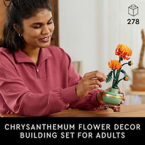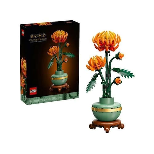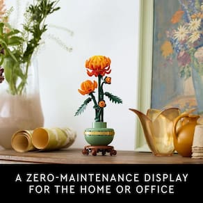 Tire um tempo com o conjunto de construção de decoração floral LEGO Icons Crisântemo 10368 para adultos. O Crisântemo é um tema popular na arte tradicional e representa o outono como parte de um quarteto clássico de lindas plantas conhecidas como as Quatro Nobres. Deleite-se com um projeto de construção consciente ou agrade uma pessoa querida com esta exposição floral atemporal, uma ideia de presente perfeita para qualquer ocasião. Esta réplica detalhada, com folhas e pétalas articuláveis, captura a flor laranja vívida em botão, florescendo e em plena floração e inclui um vaso verde pastel decorado com uma faixa dourada sobre um pedestal de efeito madeira. Fácil de montar, o modelo de crisântemo é uma peça central elegante para qualquer espaço e pode ser exibido ao lado de outros conjuntos da Coleção Botânica LEGO vendidos separadamente . Descubra um espaço para relaxar com a linha inspiradora de projetos de construção criativa LEGO feita para adultos. Uma versão digital das instruções de construção está disponível no aplicativo LEGO Builder.