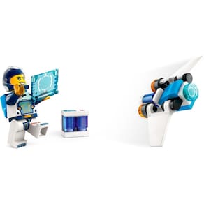 - O kit de montagem inclui uma nave espacial, um robô drone e uma minifigura de tripulação espacial;