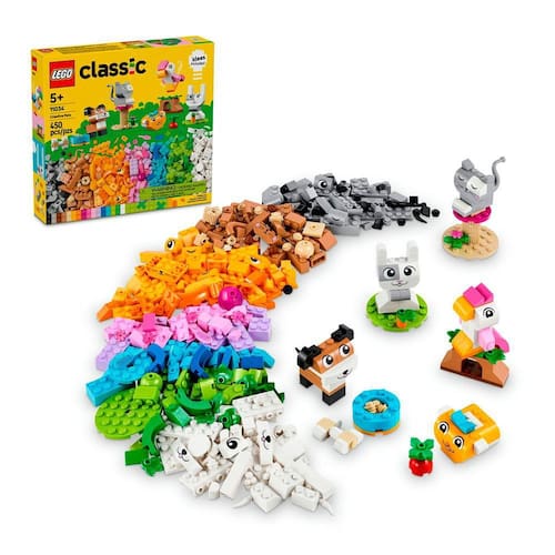 Com 450 peças LEGO para montar, com peças especiais com olhos e bocas e instruções passo a passo simples, as crianças podem construir um cachorro com uma tigela e osso, um gato em um suporte, um hamster com uma maçã, um coelho com uma cenoura e um pássaro em um poleiro.