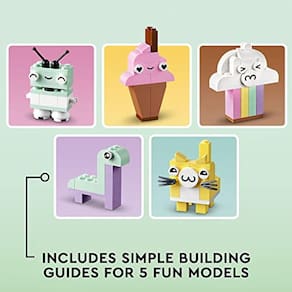 Inspire construtores iniciantes com o conjunto de brinquedos de construção LEGO Classic Creative Pastel Fun (11028) para crianças de 5+ anos. Com modelos rápidos de construir e diversão infinita de construção livre, esta mistura atraente de tijolos LEGO incentiva as crianças a se entregarem à sua paixão por arte e design. Este criativo conjunto LEGO Classic contém 333 tijolos em uma variedade de formas, tamanhos e cores pastel. 18 das peças LEGO apresentam olhos expressivos que as crianças podem usar para dar vida às suas criações. Instruções de construção impressas claras estão incluídas para 5 modelos fáceis de montar: uma nuvem, um sorvete, um dinossauro, um gato e brinquedos de robô. À medida que as crianças continuam aprendendo com os brinquedos de construção e sua confiança criativa cresce, elas podem explorar a diversão infinita de construção livre. Uma versão digital das instruções de construção do conjunto também pode ser encontrada no aplicativo LEGO Builder. Os brinquedos de construção LEGO Classic 5+ colocam ideias e inspiração nas mãos das crianças e fornecem uma oportunidade perfeita para os adultos compartilharem a diversão da construção e marcos de desenvolvimento com seus filhos. Este conjunto LEGO Classic é um ótimo presente criativo para crianças com mais de 5 anos de idade.