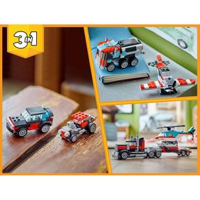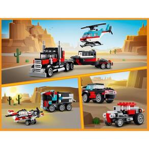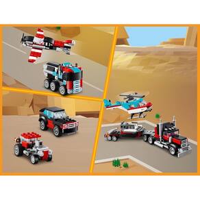 - 3 modelos para montar com as mesmas peças: caminhão plataforma e helicóptero, caminhão tanque e avião e ainda carro e buggy de corrida; - O caminhão plataforma mede 9 cm de altura, 26 cm de comprimento e 6 cm de largura; - São 270 peças, recomendado para fãs de Lego a partir de 7 anos de idade.