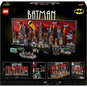 Apresentando detalhes de Batman: A Série Animada, além de cenas de ação ocultas, LEGO® DC Batman: A Série Animada Gotham City (76271) é um cativante presente de aventura cômica para criadores de modelos adultos. Este cenário GOTHAM CITY edificável de 4.210 peças mede mais de 76 cm (30 pol.) de largura. Ele incorpora 15 painéis que são removidos para revelar o interior da Mansão Wayne, da Batcaverna™ e do Asilo Arkham, além das atividades de vários vilões de Batman: A Série Animada. O conjunto também inclui 4 minifiguras – Batman, The Joker™, Harley Quinn™ e Catwoman™ – e um Batmobile™ e Batwing™ removíveis. O modelo montado pode ser montado em uma parede ou em uma superfície usando um suporte articulado. Os 2 conjuntos de instruções de construção incluídos permitem que 2 pessoas trabalhem no modelo simultaneamente. Para maior comodidade, uma versão digital das instruções de construção do conjunto pode ser encontrada no aplicativo LEGO Builder. Presente de aventura do Batman™ para adultos – entusiastas da DC e fãs do estilo 'dark deco' de Batman: The Animated Series podem saciar sua paixão com este conjunto de construção para adultos Modelo interativo para construir e exibir – 15 painéis se destacam deste conjunto LEGO® DC Super Heroes™ para mostrar o interior da Mansão Wayne, da Batcaverna™ e do Asilo Arkham, bem como as atividades de muitos vilões Personagens clássicos – Existem 4 minifiguras LEGO® DC Batman™ incluídas neste conjunto de construção para adultos: Batman, The Joker™, Harley Quinn™ e Catwoman™ Presente autêntico para os fãs do Batman™