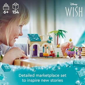 Paixão por histórias Este conjunto de construção conta com 3 personagens – Asha, sua cabra Valentino e Star – para incentivar a dramatização enquanto as crianças exploram a vida cotidiana na cidade de Rosas. Satisfaça a paixão de uma criança por histórias mágicas e por fazer desejos com um kit de construção que é um divertido presente de aniversário.