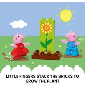 Este brinquedo LEGO DUPLO da Porquinha Peppa para crianças em idade pré-escolar ajudam-nas a desenvolver diferentes capacidades, desde a resolução de problemas e perseverança para o cultivo da planta à aprendizagem da natureza e autoexpressão enquanto enquanto brincam com a Peppa e o Jorge no jardim.