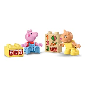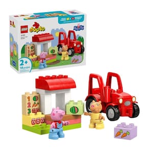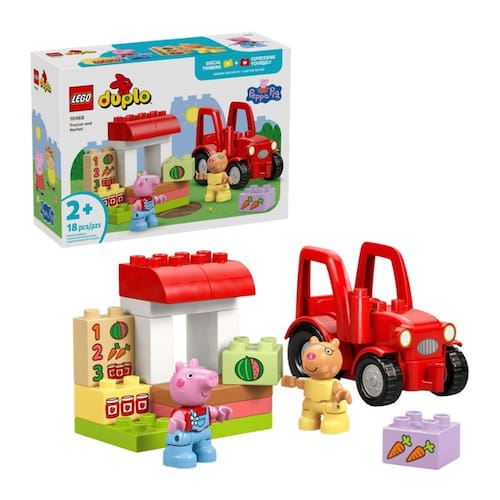 Ajude as crianças a desenvolverem a criatividade com o brinquedo de construção Trator e Mercado da Peppa Pig (10468). Crianças a partir de 2 anos podem mergulhar em brincadeiras imaginativas enquanto imitam a administração de uma mercearia e a abastecem com peças LEGO DUPLO decoradas com alimentos para vender. Este brinquedo de faz-de-conta inclui as figuras do Pedro Pony e da Peppa Pig, um trator vermelho que funciona e peças em formato de cenoura, melancia e pote de geleia. Este brinquedo educativo oferece muitas oportunidades de desenvolvimento. Ao observar e imitar cenas do desenho, as crianças podem aprimorar habilidades cognitivas, como resolução de problemas e memória.