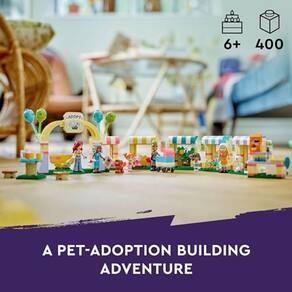 Crianças que adoram brinquedos de pets podem desfrutar de horas de brincadeira de cuidados com animais com o conjunto LEGO Friends Dia de Adoção de Pets (42615). O conjunto de brinquedos de animais inclui 4 mini bonecas, 2 micro bonecas, uma figura de bebê, 5 figuras de pets e muitos acessórios. Este brinquedo de faz de conta sócio-emocional inspira as crianças a cuidar dos pets enquanto ajudam Paisley a combinar os animais com seus novos donos. Há um porco, um gato, um hamster, um ouriço e figuras de cachorro, cada um com seu próprio abrigo. Há uma área de piquenique onde os pets e seus novos donos podem relaxar, e uma loja que vende comida para pets. Quando é hora de ir para seu lar definitivo, Paisley coloca os pets no trailer. Os acessórios incluem uma escova, maçã, caneta, tigela de comida para pets, cogumelo, canecas, papéis de adoção e comida para pets. Descubra mais brinquedos de construção para crianças no universo LEGO Friends, onde há muitas oportunidades para contar histórias enquanto as crianças encenam aventuras da vida real. Este conjunto vem com o aplicativo LEGO Builder para uma aventura de construção fácil e intuitiva. Contém 400 peças