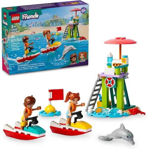 Conjunto de construção de brinquedo para salva-vidas com 2 minibonecas e um personagem golfinho – Incentive brincadeiras imaginativas com este brinquedo LEGO® Friends Beach Water Scooter para crianças, que vem com acessórios para dramatização Inclui 2 motos aquáticas – Este conjunto de brinquedos de salva-vidas vem com os personagens LEGO® Friends Leo e Candi, além de 2 motos aquáticas para que as crianças possam criar muitas histórias de praia em Heartlake City para os amigos Um brinquedo educativo para jovens construtores – Os pequenos podem praticar suas habilidades de construção antes de criar histórias para os amigos enquanto correm em suas motos aquáticas e tentam avistar o golfinho Dê vida à história – Este brinquedo de construção para crianças vem com acessórios, incluindo protetor solar, binóculos, concha, estrela do mar, colete salva-vidas e anel salva-vidas, além de um caranguejo que adora roubar picolés Uma ideia de presente para crianças – Este conjunto é um presente divertido ou um presente a qualquer hora para crianças que amam brinquedos de salva-vidas e brincadeiras criativas Ainda mais histórias de amizade – Confira outros brinquedos de dramatização (vendidos separadamente) na linha LEGO®Friends, onde as crianças encontram diversos personagens e locais enquanto representam aventuras da vida real Medidas – conjunto de 84 peças com uma torre de salva-vidas medindo mais de 11 cm de altura, 6 cm de largura e 9 cm de profundidade