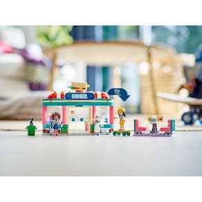 Os recursos incluem um drive-through, área externa para sentar, além de um fliperama e jukebox. As crianças podem usar os ingredientes de salada na geladeira para personalizar sanduíches. Outros acessórios incluem 2 bebidas, dinheiro, 3 fatias de pão de sanduíche, um suporte de guardanapo, uma lixeira e um skate. Há também o gato travesso que adora visitar o restaurante!Aumente a diversão de construir. Prepare-se para aventuras de construção fáceis e intuitivas com o aplicativo LEGO Builder. Nele, as crianças podem ampliar e girar modelos em 3D, salvar conjuntos e acompanhar progresso.Bem-vindos à próxima geração de Heartlake City, as crianças podem fazer amizades e conhecer locais emocionantes no universo LEGO Friends, onde podem desfrutar de brincadeiras criativas e encenar aventuras da vida real.