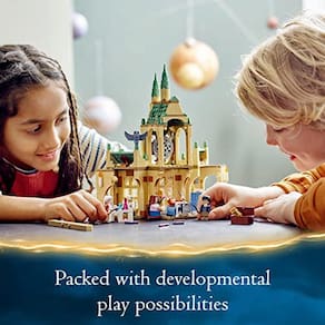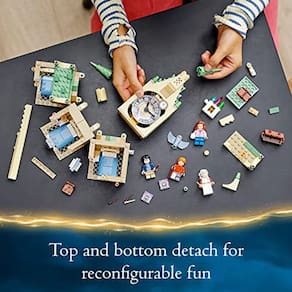 LEGO Harry Potter Hogwarts Hospital Wing (76398) está repleto de possibilidades de jogo mágico para crianças de 8 anos, desde o papel de cuidar na enfermaria até as aventuras de viagem no tempo na torre do relógio. Perfeito para os fãs de Harry Potter. Jovens bruxos e bruxos se juntam a Harry Potter, Ron Weasley e Hermione Granger em um playset versátil baseado em uma cena memorável de Harry Potter e o Prisioneiro de Azkaban. Dentro da Ala hospitalar de Hogwarts há 3 leitos, uma tela e madame Poppy Pomfrey empurrando seu carrinho cheio de poções e doces. Ron está na cama com uma perna enfaixada, e há uma garrafa do revoltante Skele-gro na mão. Enquanto isso, na torre do relógio, Harry e Hermione estão usando o Time-Turner. As crianças torcem a torre para fazer as mãos do relógio girarem e viajarem de volta no tempo para outra aventura mágica. As metades superior e inferior do conjunto se desprendem para que outros módulos possam ser empilhados no meio, e o conjunto se conecta com outros da série para criar um Castelo inteiro de Hogwarts.