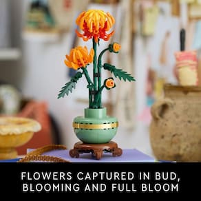Tire um tempo com o conjunto de construção de decoração de flores de crisântemo LEGO® Icons para adultos (10368). O crisântemo é um motivo popular na arte tradicional e representa o outono como parte do quarteto clássico de belas plantas conhecido como os Quatro Cavalheiros. Entregue-se a um projeto de construção consciente ou presenteie um ente querido com esta exibição floral atemporal - uma ideia de presente perfeita para qualquer ocasião. Esta réplica detalhada, com folhas e pétalas articuláveis, captura a flor laranja vívida em botão, florescendo e em plena floração e vem com um vaso de flores verde pastel decorado com uma faixa dourada e colocado em um pedestal com efeito de madeira. Fácil de montar, o modelo de planta crisântemo é uma elegante peça central para qualquer espaço e pode ser exibido junto com outros conjuntos da LEGO Botanical Collection (vendidos separadamente). Descubra um espaço para relaxamento com a ampla variedade inspiradora de projetos de construção criativa LEGO projetados para adultos. Uma versão digital das instruções de construção está disponível no aplicativo LEGO Builder. Decoração de flores de crisântemo montável – Tire um tempo de qualidade ou junte-se a amigos e familiares para um projeto consciente com o conjunto de construção LEGO® Icons Chrysanthemum para adultos O que vem na caixa – Este conjunto de construção criativo inclui tudo o que você precisa para criar uma planta de crisântemo e um vaso de flores verde pastel com uma faixa dourada e um pedestal com efeito de madeira Botões florescendo – O LEGO® Icons Chrysanthemum com folhas e pétalas articuláveis, captura a flor laranja vívida em vários estágios, incluindo 1 em plena floração, 1 florescendo e 2 em botão Decoração de casa sem manutenção – Adicione um toque de cor à sua casa ou escritório com este crisântemo em vaso sem manutenção Um presente de planta LEGO® – Comemore um aniversário ou qualquer ocasião especial, ou surpreenda um ente querido com um presente projetado para fãs adultos de conjuntos de construção LEGO, decoração para casa e flores Inclui instruções de construção digitais – O aplicativo LEGO® Builder apresenta uma versão digital das instruções de construção incluídas neste conjunto de construção de flores LEGO Parte da coleção LEGO® Botanical – Descubra um espaço para relaxar com a ampla variedade de conjuntos de construção LEGO projetados especificamente para adultos Dimensões – O crisântemo, incluindo vaso de planta e pedestal, neste conjunto de construção de 278 peças mede mais de 10,5 pol. (26 cm) de altura, 4 pol. (10 cm) de largura e 3,5 pol. (9 cm) de profundidade