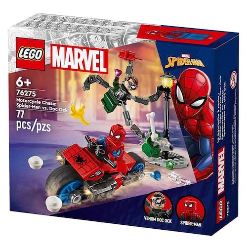 Batalha Épica: Inclui uma motocicleta do Homem-Aranha montável com atiradores de espigas e 2 minifiguras: Homem-Aranha com atiradores de teia e o temível Doc Ock com 4 tentáculos flexíveis.