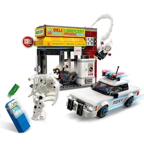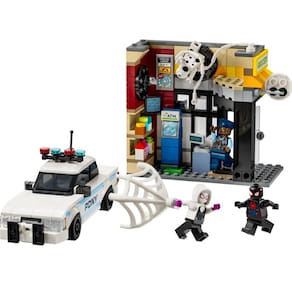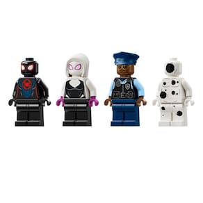 O conjunto de jogos do Homem-Aranha vem com 4 minifiguras: Miles Morales, The Spot, Gwen Stacy e o Oficial Jefferson. A loja de conveniência tem um recurso de parede explosiva que permite que o caixa eletrônico seja removido. Os acessórios incluem uma corda de teia longa e flexível e uma teia flexível que é grande o suficiente para envolver uma minifigura. O carro da polícia abre para permitir que 2 minifiguras sejam colocadas dentro.