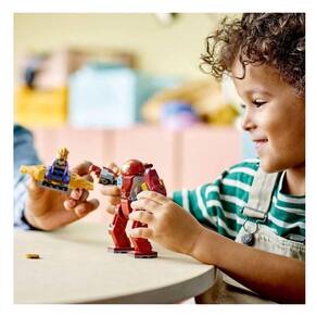 Inspirado no filme Vingadores: Guerra Infinita da Marvel Studios, este conjunto colocar o Super-Herói Homem de Ferro e seu robô contra o super-vilão Thanos e sua aeronave. O robô Caça-Hulk é totalmente posicionável e inclui um assento para a minifigura do Homem de Ferro. A aeronave tem um disparador de discos e um assento para a minifigura do Thanos. Dentro da caixa, cada embalagem de peças conta com um modelo completo e um personagem que as crianças podem montar para brincar imediatamente. Uma história ilustrada colorida serve como um guia para construir e brincar, e as 2 Peças Iniciais de pernas de robô simplificam a construção. Para ainda mais diversão digital, os construtores podem ampliar e girar conjuntos em 3D e acompanhar o progresso deles usando o divertido e intuitivo aplicativo LEGO Builder.