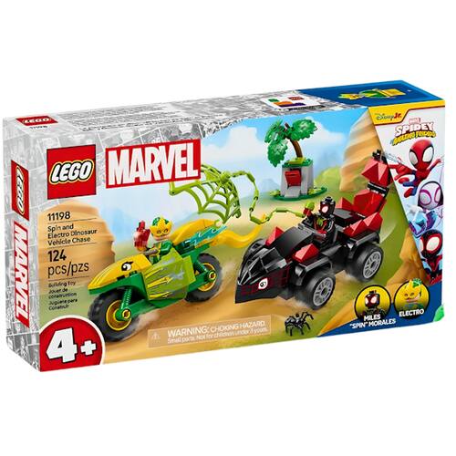 Descrição do produto : " Presenteie os fãs de Spidey e Seus Amigos Incríveis com este brinquedo de super-herói montável. O kit de construção e brincadeira Spin and Electro Dinosaur Vehicle Chase (11198) foi projetado para desenvolver a confiança criativa das crianças, melhorar as habilidades de resolução de problemas e inspirar brincadeiras imaginativas sem fim em meninos e meninas de 4 anos ou mais. O conjunto recria a ação da temporada 'Dino-Webs' do programa de TV Spidey And His Amazing Friends. Inclui 2 minifiguras de super-heróis e 2 veículos dinossauros de empurrar: Miles ""Spin"" Morales em um carro de estegossauro e Electro em uma motocicleta de dilofossauro. Um grande elemento de teia, um cristal escondido dentro de uma rocha, além de acessórios de paisagismo inspiram a dramatização criativa das crianças. Dentro da caixa, cada bolsa contém tijolos e um grande tijolo inicial para um modelo e personagem rápidos de construir, para que a brincadeira comece rapidamente. Instruções intuitivas são fornecidas na forma de um guia de história com imagens coloridas. : " Detalhes técnicos : Marca: Lego : Referência: 11198 : Idade recomendada: 4 : Quantidade de peças: 124 : Possui Luzes: Não : Possui Sons: Não : Dimensões aproximadas da embalagem: 26 x 14 x 6 cm (A x L x C) : Ean: 673419404358 :