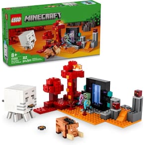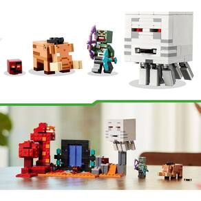 - O kit de montagem inclui um cenário do portal do nether, a minifigura do guerreiro Orc, 2 cubos de magma, figuras montáveis de Ghast e Hoglin e acessórios;