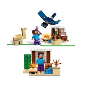 É o primeiro brinquedo de construção para crianças localizado no bioma do deserto de Minecraft. A Expedição do Steve ao Deserto desafia as crianças a construir uma casa de Minecraft em um ambiente hostil, depois defendê-la contra um ataque do Fantasma voador. Esse presente de faz de conta reconfigurável para meninos e meninas maiores de 6 anos contém 3 figuras LEGO Minecraft, incluindo o Steve, além de uma barraca do Minecraft no bioma do deserto. O conjunto inclui elementos icônicos do Minecraft, como a bancada, fogueira e várias peças de um cenário de deserto. Um ótimo presente para qualquer fã de Minecraft, o conjunto inspira aventuras criativas e batalhas eletrizantes quando um Fantasma voador com asas móveis mergulha para atacar a base. O conjunto também contém uma expressão facial atualizada pra o Steve e a primeira aparição do Camelo Bebê em um conjunto LEGO Minecraft. Contém 75 peças.