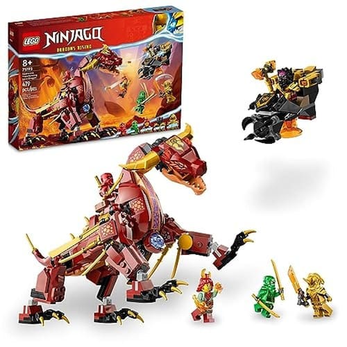 Os fãs de ninjas a partir de 8 anos podem recriar suas cenas favoritas da série de TV NINJAGO Dragons Rising com este conjunto Heatwave Transforming Lava Dragon (71793). Ele apresenta um dragão nunca antes visto que as crianças podem brincar em 2 modos. No modo pacífico, ele fica majestosamente de pé, mas quando virado de cabeça para baixo, ele se transforma para o modo de batalha, permitindo disparar um elemento de poder do dragão roxo do peito. Este conjunto de brinquedo de dragão ninja vem com 5 minifiguras: Kai e Lloyd, cada um armado com 2 katanas, Wyldfyre com seu punho de bola de fogo, Imperium Claw Hunter com uma espada Imperium e Lord Ras com um martelo dourado e um hovercraft de batalha. É um ótimo presente de aniversário para crianças a partir de 8 anos. Há 4 elementos de poder de dragão em cores diferentes e 3 núcleos de energia de dragão para as crianças coletarem em outros conjuntos NINJAGO. Deixe o aplicativo LEGO Builder guiar você e seu filho em uma aventura de construção fácil e intuitiva. Contém 479 peças.