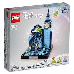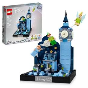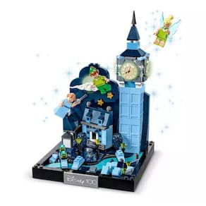 O conjunto inclui a icônica torre do relógio Big Ben, um fundo do céu noturno, casas, árvores, luzes de rua e muito mais. Os mostradores de relógio e a lua brilham no escuro, trazendo vida e encanto à cena. A placa Disney100 na base do conjunto mostra o orgulho em fazer parte das celebrações do Disney100.