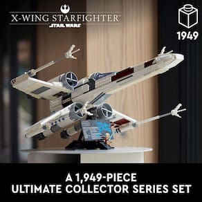O X-Wing mede mais de 55 cm de comprimento e inclui um expositor construível que inclui uma placa mostrando os dados técnicos do X-Wing e espaço para a minifigura LEGO inédita lançada em maio de 2023 do Luke Skywalker com seu sabre de luz.