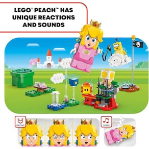 Junte-se a um personagem icônico do Super Mario™ para um piquenique e voe em uma nuvem para resgatar o Sapo Amarelo com o conjunto de brinquedo de princesa Aventuras com LEGO® Peach™ interativo para crianças (71441). Um excelente presente da Nintendo® para meninas, meninos e jogadores a partir de 6 anos, o conjunto apresenta uma figura interativa LEGO Peach, além de Lakitu, um Sapo Amarelo e uma Bolha de Lava. Viaje do tubo inicial até o mastro da meta, desencadeando reações digitais do LEGO Peach e coletando moedas ao longo do caminho. Faça um piquenique, leia uma carta dizendo que o Sapo Amarelo foi capturado, derrube Lakitu da nuvem e voe, vire e dê uma volta na nuvem no caminho para resgatar o Sapo Amarelo.