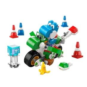 – vendidos separadamente) para uma brincadeira interativa, incluindo efeitos sonoros para início de corrida, buzina, derrapagem e modo pairar, e fique atento à Caixa de Itens que oferece itens digitais aleatórios para usar na corrida. Este brinquedo LEGO Super Mario é ótimo para brincadeiras independentes ou como atividade social. Confira outros conjuntos LEGO Super Mario: Mario Kart (vendidos separadamente) na variedade para mais veículos legais para correr. Ideia de presente Nintendo® para crianças – Dirija e derrape em um modelo de Yoshi Bike construído com peças com este conjunto de brinquedos de aventura LEGO® Super Mario™: Mario Kart™ Inclui uma figura de brinquedo Yoshi azul-claro – Pela primeira vez em um conjunto LEGO® Super Mario™, encontre uma figura Yoshi azul-claro, além de um elemento Banana com decoração facial Brinquedo Yoshi Bike