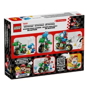 Acelere para uma ação emocionante de dirigir e derrapar com este conjunto de brinquedo de aventura colecionável LEGO® Super Mario™: Mario Kart™ – Yoshi Bike para crianças (72031). Uma ideia de presente emocionante da Nintendo® para meninos, meninas e jogadores de 7 anos ou mais, o conjunto apresenta um modelo de tijolos da Yoshi Bike e, pela primeira vez em um conjunto LEGO Super Mario, uma figura de brinquedo Light-Blue Yoshi. Ajude o Light-Blue Yoshi a dirigir a moto entre 4 cones de trânsito, lançar conchas da moto e desviar da Banana. Ande de bicicleta com uma figura LEGO® Mario™, LEGO® Luigi™ ou LEGO® Peach™ (dos conjuntos 71439, 71440 ou 71441