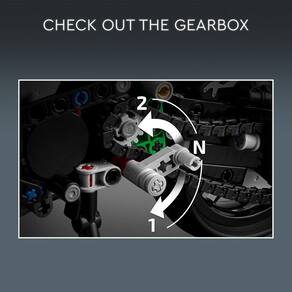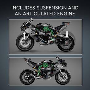 – a Kawasaki Ninja H2R. Este modelo de motocicleta em escala 1:8 para presente para crianças possui direção, suspensão, caixa de câmbio de 2 velocidades, motor articulado de 4 pistões e compressor. O elemento especial do pára-brisa apresenta decoração personalizada e o logotipo da Kawasaki aparece em ambos os lados do tanque de combustível. As crianças podem se divertir recriando os recursos e brincando com as diferentes funções antes de usar o suporte para exibir seu modelo de veículo com orgulho. Os conjuntos de construção LEGO Technic para crianças apresentam detalhes realistas que apresentam aos jovens construtores LEGO a engenharia de uma forma acessível.