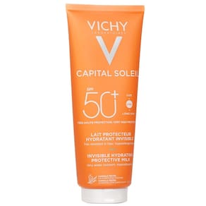 Um leite solar resistente à água e de alta proteção para rosto e corpo A textura leve e não oleosa é fácil de aplicar e não deixa marcas brancas. Usa um sistema de filtro de amplo espectro e o Mexoryl® fotoestável à base de UVA-UVB protege a pele contra os efeitos nocivos do sol. Repleto de ácido hialurônico para fornecer hidratação 24 horas. Enriquecido com água termal mineralizante de Vichy para fortalecer as defesas naturais da pele. Ideal para famílias. Livre de parabenos e fragrância hipoalergênica e adequada para peles sensíveis
