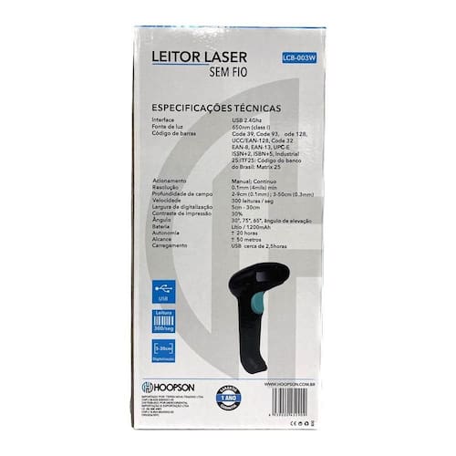 Leitor de código de barra sem fio hoopson lcb-003w - leitor digital: código de barras, e boleto - lcb-002 - o leitor digital lcb-002 é um equipamento de alta qualidade que pode ser utilizado para leituras de contas de consumo, boletos bancários por internet banking e , além de leituras em sistemas de automação comercial utilizados em comércios de praticamente qualquer segmento. Interface usb 2.4ghz sem fio , Fonte de luz 650mm class i , Código de barras code 39, Code 93, code 128, , ucc/ean-13, ucp-e, issn+2, isbn+5, Industrial 25: itf25: código do banco do brasil: matrtix 25, Acionamento manual: contínuo, Resolução 0.1mm 4mils min, Profundidade de campo 2-9cm 0.1mm ; 3-50cm 0.3mm , Velocidade 300 leitura/seg, largura de digitação 5cm-30cm, Contraste de impressão 30%, Ângulo 30, 75, 65, ângulo de elevação, Bateria lítio/1200mah, Autonomia +- 20 horas, Alcance -+ 5 metros, Carregamento usb/cerca de 2,5 horas, Inclui cabo micro usb para carregamento. Homologação Anatel: 034411407561