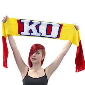 - O cachecol apresenta as cores amarelas e vermelhas icônicas da barra HP e símbolo KO.