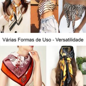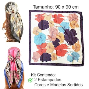 Lenço Quadrado Grande Cetim Seda Multiuso Echarpe Cropped Bandana: Kit 2 Estampados.