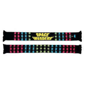 Mostre seu amor por jogos de vídeo retrô com este clássico cachecol Space Invaders. Este cachecol de malha confortável apresenta um fundo preto e design reversível. Um lado exibe o logotipo do Space Invaders, alienígenas e canhão de laser em ação, enquanto o verso mostra linhas de três alienígenas em cascata coloridas diferentes. Acabamento decorativo de franjas, 90% acrílico/10% elastano.