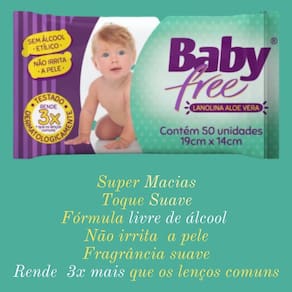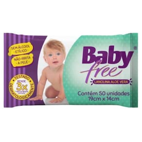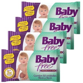 Lenço Umedecido Baby Free 4 Pacotes c/50 unidades(total:200) Lenço ou Toalha Umedecida Baby Free Quantidade: 4 pacotes com 50 toalhas (total: 200 toalhas) Medida de cada toalha: 19 cm x 14 cm Você vai se surpreender com a maciez e a qualidade da Baby Free Rende 3x mais que os lenços comuns As toalhas umedecidas BabyFree são testadas dermatologicamente sendo mais macias, espessas e absorventes. Desenvolvida especialmente para pele delicada do bebê. Sua fórmula suave é enriquecida com extratos de aloe vera e lanolina que hidratam e protegem a pele do bebê.? Embalagem flowpack abre e fecha. Super Macias. Toque Suave. Fórmula Livre de Álcool. Não Irrita a Pele. Possui Ação Demaquilante. Fragrância Suave. Agentes Hidratantes de Aloe Vera e Lanolina.