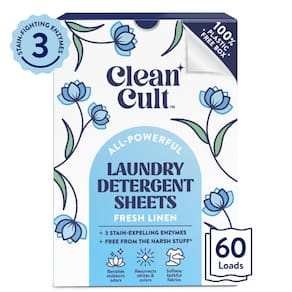 Cleancult Folhas de detergente para roupas – caixa resselável – 3 enzimas que combatem manchas – linho fresco – 60 cargas – livre de produtos químicos agressivos – sem bagunça – sem resíduos de