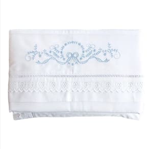 Características: - Jogo de lençol para berço - 3 peças: lençol superior, lençol inferior e fronha - Percal 180 fios - Toque suave e macio - Lençol de baixo com elástico - Bordado inglês com laço azul - Ponto palito