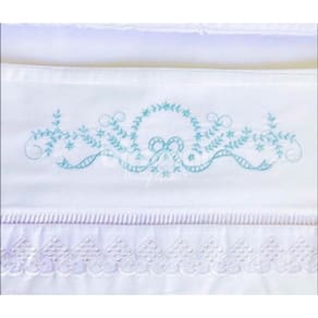 Esse jogo de lençol possui um lindo bordado inglês com laço azul, trazendo um toque delicado e discreto ao enxoval do seu bebê. Além disso, o ponto palito também é um detalhe charmoso que valoriza o produto.