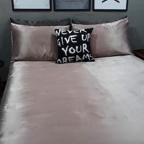 Kit composto por 4 peças. 1 lençol com elástico para cama de 1,88cmx1,38cm para colchões de até 40cm de altura - lençol em cetim cor cobre light 2 capas de travesseiros ( fronhas ) de 0,70cmx0,50cm - capas em cetim cor cobre light 1 almofada exclusiva da grife de 45cm x 45cm com enchimento - preto com estampa em branco - estampa: never give up your dreams - nunca desista dos seu sonhos - almofada com enchimento.