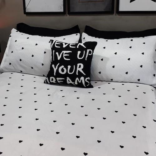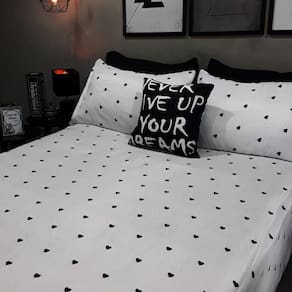 Lençol Com Elástico Casal Comum 4 Un Love Black Com AlmofadaJogo de lençol para clientes que além do conforto, não abre mão de exclusividade e bom gosto também ao se deitar. Com designer rico, despojado e jovial, os jogos de lençóis da marca garantem um clima atemporal para o seu quarto. Pensados e ousados para valorizar o seu decor.Disponível para cama: casal comumKit composto por 4 peças.1 lençol com elástico para cama de 1,88cmx1,38cm para colchões de até 40cm de altura - lençol cor branco com estampa love black2 capas de travesseiros fronhas de 0,70cmx0,50cm - capas em cor branco com estampa love black1 almofada exclusiva da grife de 45cm x 45cm com enchimento - preto com estampa em branco - estampa: never give up your dreams - nunca desista dos seu sonhos - almofada com enchimento. Detalhes:Lençol com elástico em toda extremidade barra para garantir um melhor ajuste no seu colchão sem ficar escapando e subindo ao se deitar. Elástico de alta qualidade para melhor pressão e facilidade ao vestir no seu colchão. Almofadas com zipper invisível para um acabamento delicado e de fácil lavagem. Acompanha enchimentoEm fibra siliconada revestida por polipropileno antialérgico. Capas de travesseiros não acompanham enchimento.Composição do produto:Lençol e capas de travesseiros em microfibra 180 fios. Tecido de toque macio e anti-pillingAlmofada em microfibra 180 fios print anti-pillingNossas peças são reconhecidas mundialmente pela qualidade e veracidade a qual vendemos pela internet. As almofadas a venda é composto por todas as peças da foto imagem, incluindo os enchimentos.Nossa estampa é 100% digital, podendo lavar por varias vezes sem perder a resolução da estampa e nem desbotar com o tempo.Atenção: o produto pode sofrer pequena alteração de tonalidade de cor dependendo da configuração do seu computador, tablet ou celular. Marca: Casa Da Fama