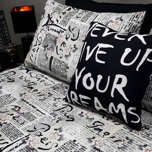 Kit composto por 4 peças. 1 lençol com elástico para cama de 1,88cmx1,38cm para colchões de até 40cm de altura - lençol estampa Paris Designer 2 capas de travesseiros fronhas de 0,70cmx0,50cm - capas estampa Paris Designer 1 almofada exclusiva da grife de 45cm x 45cm com enchimento - preto com estampa em branco - estampa: never give up your dreams - nunca desista dos seu sonhos - almofada com enchimento.