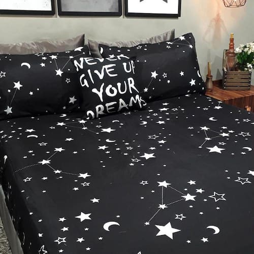 Lençol Com Elástico Casal Comum 4 Un Star Decor Com AlmofadaKit lençol com elástico 4 peças estampa Star Designer com almofada exclusivaJogo de lençol para clientes que além do conforto, não abre mão de exclusividade e bom gosto também ao se deitar. Com designer rico, despojado e jovial, os jogos de lençóis da marca garantem um clima atemporal para o seu quarto. Pensados e ousados para valorizar o seu decor.Disponível para cama: CASAL COMUMKit composto por 4 peças.1 lençol com elástico para cama de 1,88cmx1,38cm para colchões de até 40cm de altura - lençol cor preto com estampa Star Designer2 capas de travesseiros fronhas de 0,70cmx0,50cm - capas em cor preto com estampa Star Designer1 almofada exclusiva da grife de 45cm x 45cm com enchimento - preto com estampa em branco - estampa: never give up your dreams - nunca desista dos seu sonhos - almofada com enchimento. Detalhes:Lençol com elástico em toda extremidade barra para garantir um melhor ajuste no seu colchão sem ficar escapando e subindo ao se deitar. Elástico de alta qualidade para melhor pressão e facilidade ao vestir no seu colchão. Almofadas com zipper invisível para um acabamento delicado e de fácil lavagem. Acompanha enchimentoEm fibra siliconada revestida por polipropileno antialérgico. Capas de travesseiros não acompanham enchimento.Composição do produto:Lençol e capas de travesseiros em microfibra 180 fios. Tecido de toque macio e anti-pillingAlmofada em microfibra 180 fios print anti-pillingNossas peças são reconhecidas mundialmente pela qualidade e veracidade a qual vendemos pela internet. As almofadas a venda é composto por todas as peças da foto imagem, incluindo os enchimentos.Nossa estampa é 100% digital, podendo lavar por varias vezes sem perder a resolução da estampa e nem desbotar com o tempo.Atenção: o produto pode sofrer pequena alteração de tonalidade de cor dependendo da configuração do seu computador, tablet ou celular. Marca: Casa Da Fama