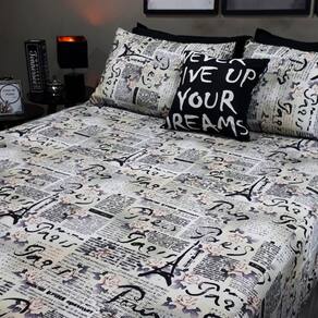 Kit composto por 4 peças. 1 lençol com elástico para cama de 1,98cmx1,86cm para colchões de até 40cm de altura - lençol estampa Paris Designer 2 capas de travesseiros fronhas de 0,70cmx0,50cm - capas estampa Paris Designer 1 almofada exclusiva da grife de 45cm x 45cm com enchimento - preto com estampa em branco - estampa: never give up your dreams - nunca desista dos seu sonhos - almofada com enchimento.