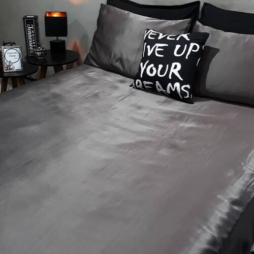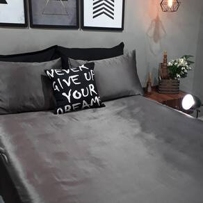 Kit composto por 2 peças. 1 lençol com elástico para cama de 1,88cmx0,88cm para colchões de até 30cm de altura - lençol em cetim grafite. 1 capas de travesseiros fronhas de 0,70cmx0,50cm - capa em cetim grafite.