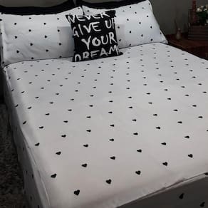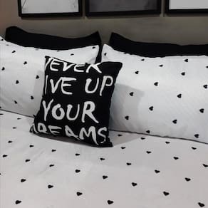 Kit composto por 4 peças. 1 lençol com elástico para cama de 2,03cmx0,96cm para colchões de até 40cm de altura - lençol cor branco com estampa love black 2 capas de travesseiros ( fronhas ) de 0,70cmx0,50cm - capas em cor branco com estampa love black 1 almofada exclusiva da grife de 45cm x 45cm com enchimento - preto com estampa em branco - estampa: never give up your dreams - nunca desista dos seu sonhos - almofada com enchimento.