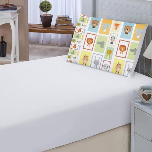 O lençol possui um tamanho adequado para colchões infantis e conta com elástico em toda a borda, o que ajuda a mantê-lo firme no lugar durante a noite, evitando que se mova ou se deslize enquanto a criança dorme. A fronha tem uma abertura lateral, facilitando a colocação e retirada do travesseiro.
