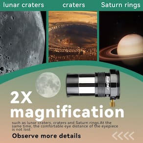 Esta lente Barlow 2x com corpo de metal. A lente totalmente multirevestida oferece uma visão nítida. Pode dobrar a potência de qualquer ocular de telescópio de 3,15 cm. Ideal para observação de alta potência. Um anel de compressão de latão pode proteger sua ocular de danificar ou arranhar o cano. Mantém sua ocular com um visual novo. O barlow também tem um fio em T macho na parte traseira que pode ser utilizado para fixar uma câmera DSLR e outros acessórios do tipo T-thread. Observação: insira a lente Barlow entre sua ocular e seu telescópio para obter a ampliação instantaneamente. O alívio ocular é a distância que seu olho deve estar da primeira lente da ocular para ver todo o campo de visão. Quando você usa uma lente Barlow com uma ocular, você obtém a ampliação, mas o alívio dos olhos não é afetado. Isso é uma coisa boa, porque normalmente quanto menor a distância focal da ocular, menos alívio para os olhos você tem. Especificações: Ampliação: 2x Interface: 3,15 cm / M42 x 0,75 Revestimento: totalmente multi-revestido Bordas da lente: enegrecida Proteção ocular: anel interno de latão Peso líquido: 90 g. Dimensão: 74 x 39 x 39 mm. A embalagem inclui: 1 lente SV137 2x Barlow com adaptador T. 2 capas contra poeira - Oferece visualização confortável; usar a lente Barlow 2x com uma ocular de distância focal mais longa permite que você obtenha a mesma visão de alta ampliação; mas na maioria dos casos a lente ocular será muito maior; ajudando a reduzir o cansaço visual e melhorar o conforto - Material de alumínio de qualidade e corpo anodizado preto; usinado com precisão; resistente para uso prolongado - Lente multirevestida de largura de banda total; certifique-se de que a taxa de transmissão de luz recebida seja de até 97% para que você possa ver mais facilmente imagens claras e brilhantes - Design de anel de latão; o anel de pressão de latão embutido na extremidade de inserção da ocular garante que a superfície do corpo da lente ocular inserida de alta qualidade não seja acidentalmente arranhada - 2 lentes Barlow bem feitas, tubo preto flocado no interior; todos os parafusos de fixação de metal; design de revestimento antiderrapante; a aparência geral é bonita e sofisticada