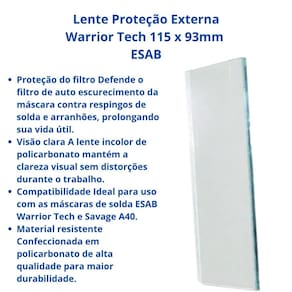 Benefícios - Proteção do filtro: Defende o filtro de auto escurecimento da máscara contra respingos de solda e arranhões, prolongando sua vida útil. - Visão clara: A lente incolor de policarbonato mantém a clareza visual sem distorções durante o trabalho. - Compatibilidade: Ideal para uso com as máscaras de solda ESAB Warrior Tech e Savage A40. - Material resistente: Confeccionada em policarbonato de alta qualidade para maior durabilidade.