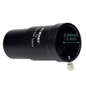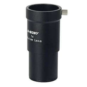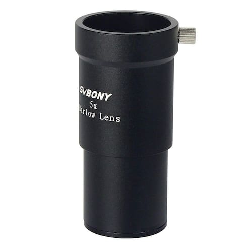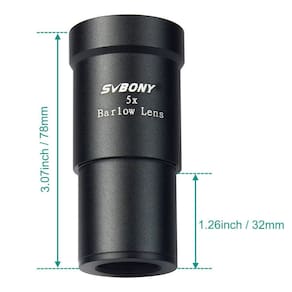 Mais ampliação para oculares existentes para ver os detalhes da lua e das faixas de Júpiter claramente; a lente Barlow é essencial Lentes SVBONY 5x Barlow de alta potência de qualidade e valor para dar um grande aumento de ampliação a qualquer ocular de 3 cm. Ele ajudará a dobrar a capacidade de um conjunto de oculares existente ao custo de uma única ocular; é super fácil de usar; você pode simplesmente inserir a ocular de sua escolha na lente Barlow; então inseri-la no telescópio. A lente Barlow também pode fornecer mais ampliação sem reduzir o orifício de saída na ocular. Características: 5x fator de ampliação com interface de 3,16 cm: Ampliação de 5 vezes de qualquer ocular de 3 cm. Lentes de vidro óptico multirevestidas de qualidade: Alta transmissão; garante visualizações claras e nítidas. Design APO de três elementos: Oferece observação de alta qualidade sem introduzir aberração cromática adicional. Corte inferior de segurança e anel de compressão de latão: Certifique-se de que os cilindros da ocular não serão danificados pelo parafuso de fixação cativo. Material de alumínio de qualidade e corpo anodizado preto: Usinado com precisão; resistente para uso prolongado. Altura curta 9,9 cm 100 mm: Conveniente de usar e transportar. Capa contra poeira: Mantenha as lentes transparentes facilmente. Conteúdo da embalagem: 1 lente Barlow 5x. Atenção: O papel da lente Barlow não é apenas melhorar a qualidade da imagem; também desempenha um papel importante de visualização confortável. Mesmo um Barlow bem feito causará pequenos danos à qualidade da imagem. Quando a lente Barlow e a ocular usam juntas; se a ampliação estiver acima da maior ampliação; o efeito de observação da lente Barlow parece quase zero ou a imagem fica desfocada. Para reduzir a influência da imagem; a seleção cuidadosa das lentes Barlow em diferentes ampliações é muito importante. - O valor deve ter uma lente barlow de 5x duplica a ampliação de qualquer ocular de 3,15 cm; o dobro da capacidade de um conjunto de oculares existente ao custo de uma única ocular - Material de alumínio de qualidade e corpo anodizado preto - Lentes de grupo de 3 elementos e 2 com design óptico multirevestido tornam a imagem mais nítida e nítida - Material de alumínio de alta qualidade e corpo anodizado preto para um uso conveniente a longo prazo - Película verde de banda larga de 2 elementos um grupo de vidro óptico multirevestido; a caixa é escurecida para maximizar o contraste da imagem