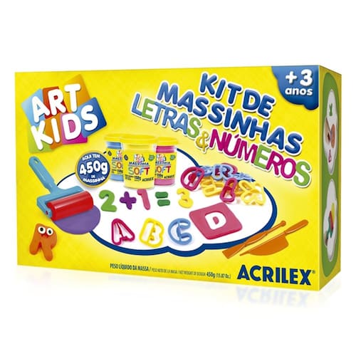 O Kit de Massinhas Letras e Números Acrilex é ideal para a criança brincar e se divertir desenvolvendo a criatividade. Possui diversas forminhas e utensílios incríveis que estimulam a coordenação motora e a percepção visual. Com os diversos moldes coloridos ficou mais fácil e divertido aprender as letras e os números. Características: O kit contém 3 potes de Massinha de Modelar Soft 150g - 55 moldes - 2 faquinhas - 1 rolinho - Não tóxico - Massa à base de amido. Produto certificado conforme Portaria Inmetro Nº 333/2012:Segurança Compulsório CE-BRI/BRICS 00246-15 NM 300/2002 INMETRO